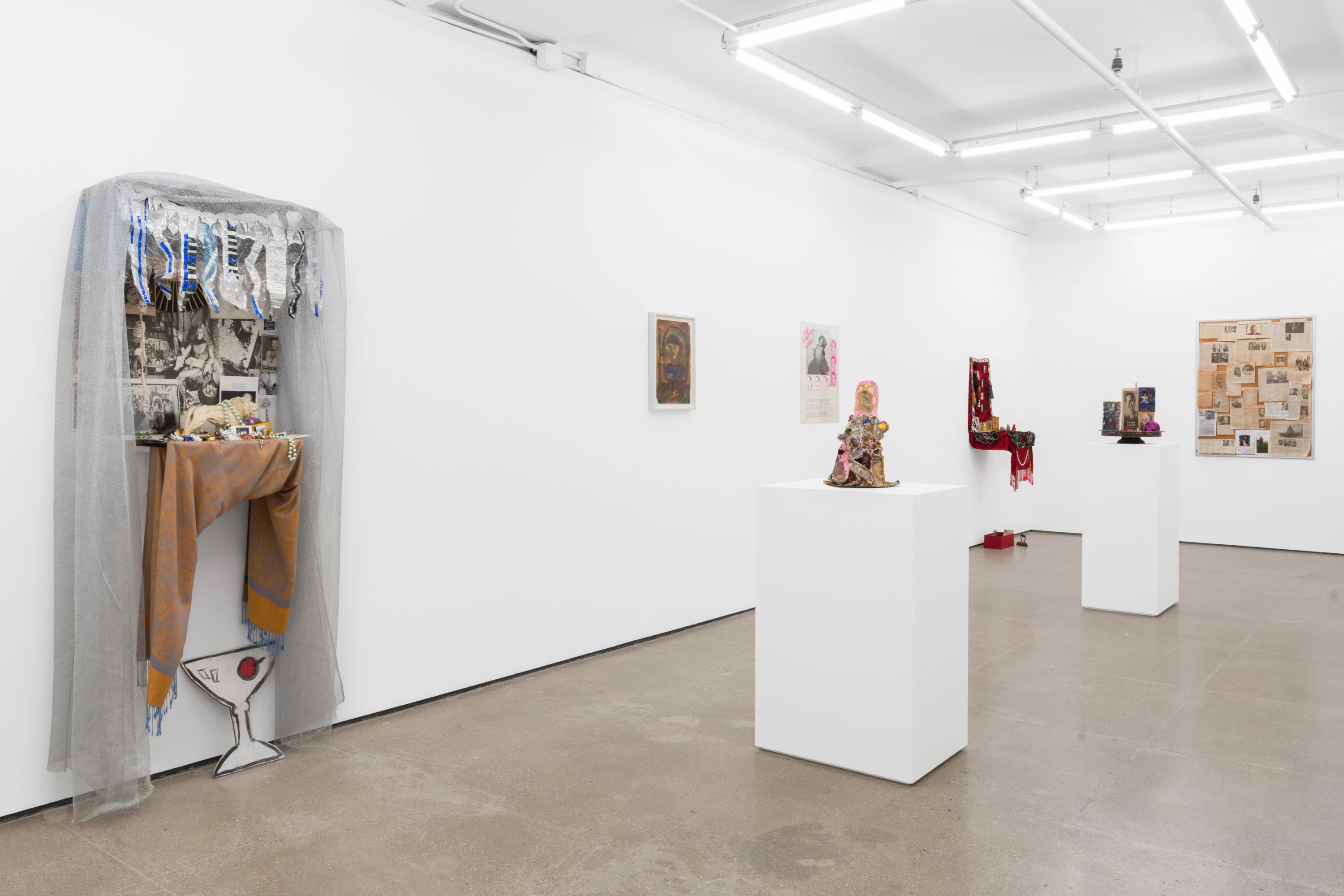 The installation is anchored by six of Machado’s new wall-based works, the largest of which is Shrine (Queens), a grotto-like sculpture dense with unique artworks and ephemera displayed on shelves and surrounded by fabric and plastic icicles created by Thomas Lanigan-Schmidt. The shrine celebrates legendary drag performance artists Jackie Curtis, Divine, International Chrysis, Flawless Sabrina, Tabboo!, and John Flowers of the Cockettes.
