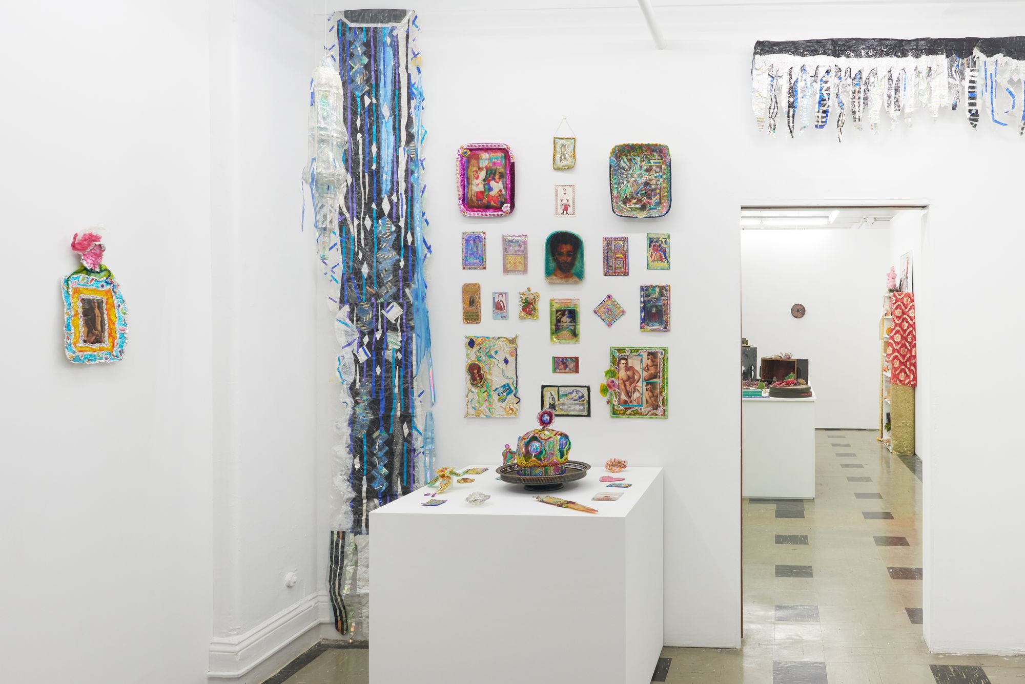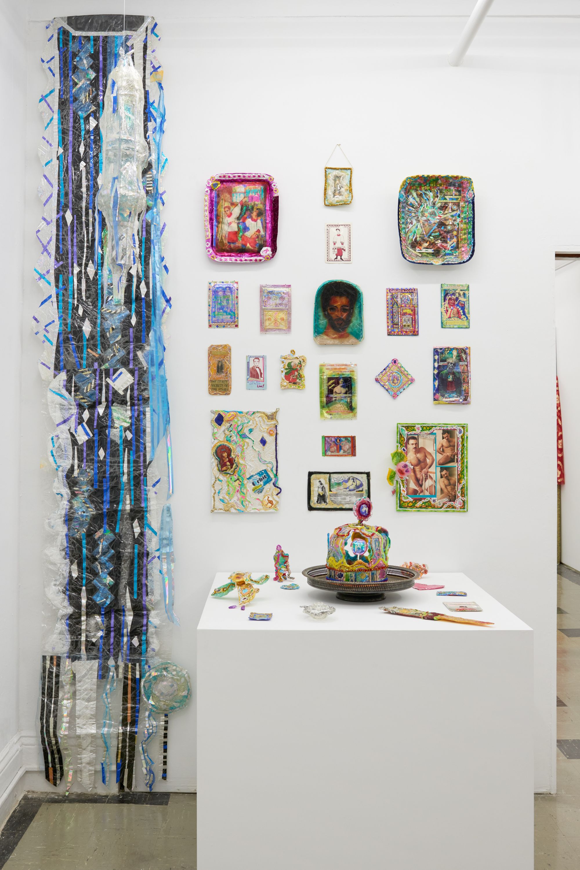 For the exhibition at Gordon Robichaux, a group of Machado’s installations will be presented alongside artworks and ephemera from his collections. Highlights include a box of Jack Smith’s performance props, a group of Thomas Lanigan-Schmidt’s glittering foil reliquary objects, examples of Arch Connelly’s jeweled paintings and collage, two Martin Wong paintings of brick walls, and works by self-taught artists including Tomata du Plenty and others associated with the East Village, such as Caroline Goe, Grady Alexis, Miguel “Mickie” Perez, and Sir Shadow. Two shrines in bookcases are composed of carefully arranged photographs and relics of Jack Smith, Ethyl Eichelberger, Mario Montez, Candy Darling, Holly Woodlawn, Jackie Curtis, Peter Hujar, Ellen Stewart, Marsha P. Johnson, and Taylor Mead, surrounded by Mexican skeleton figurines and artificial flowers.