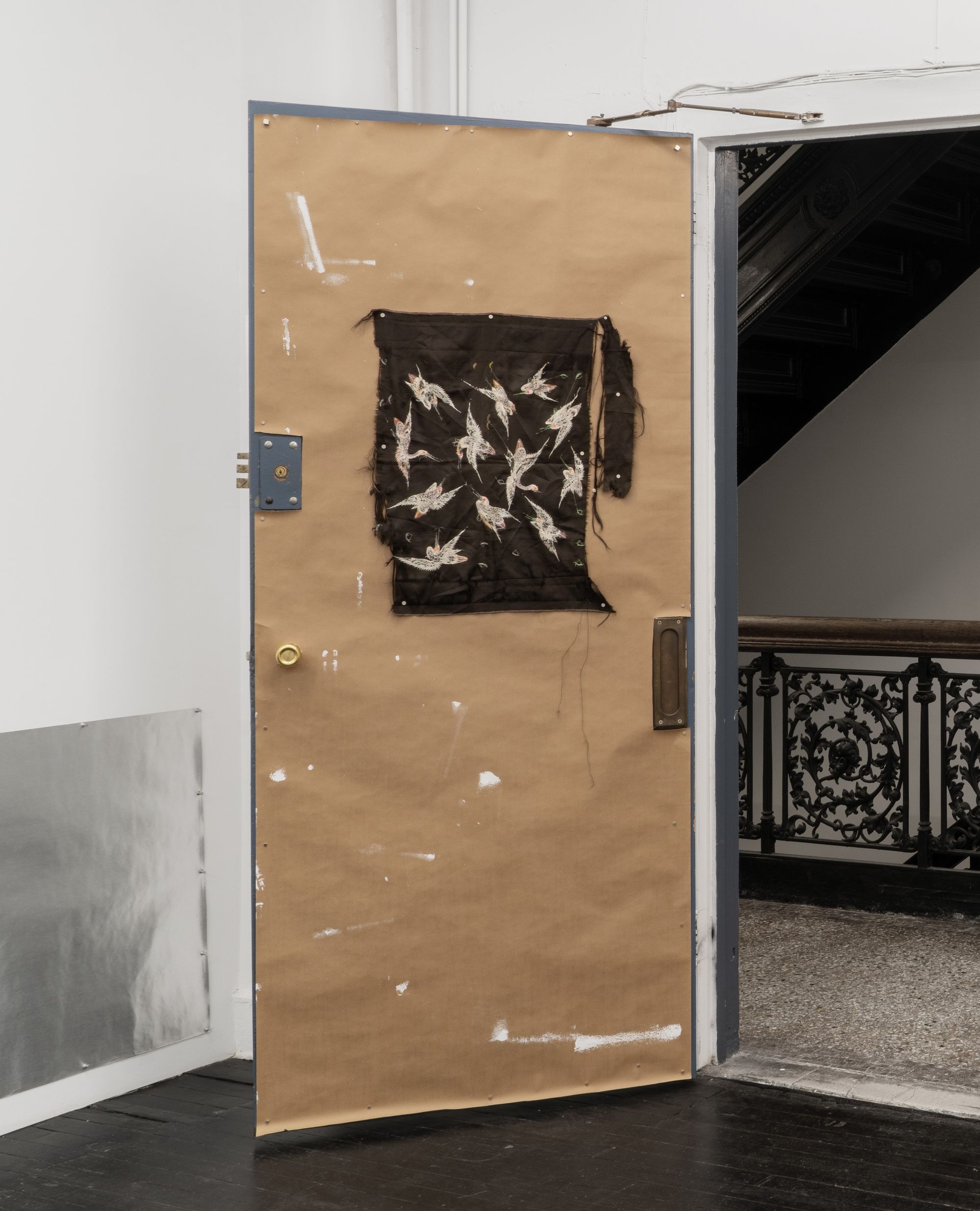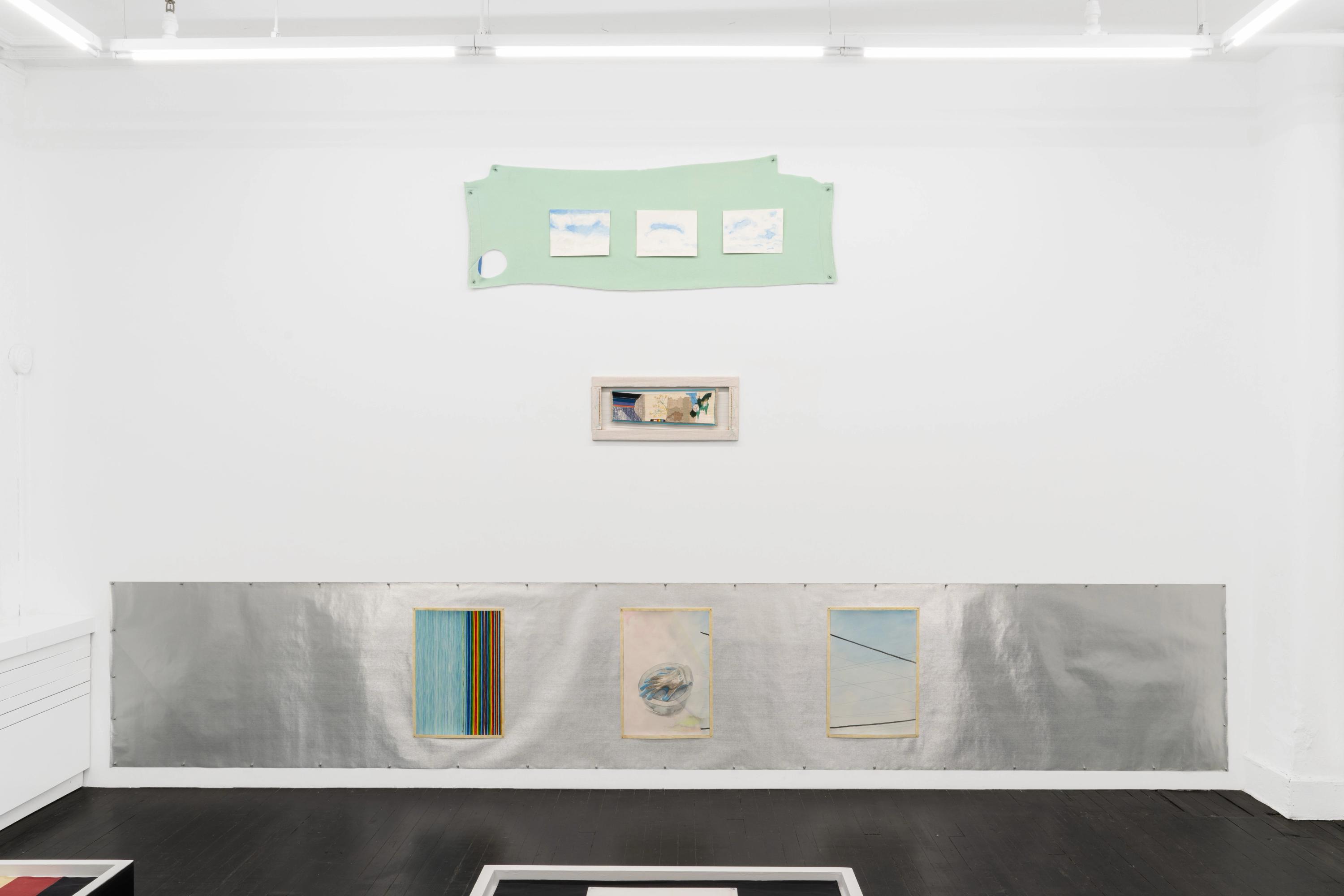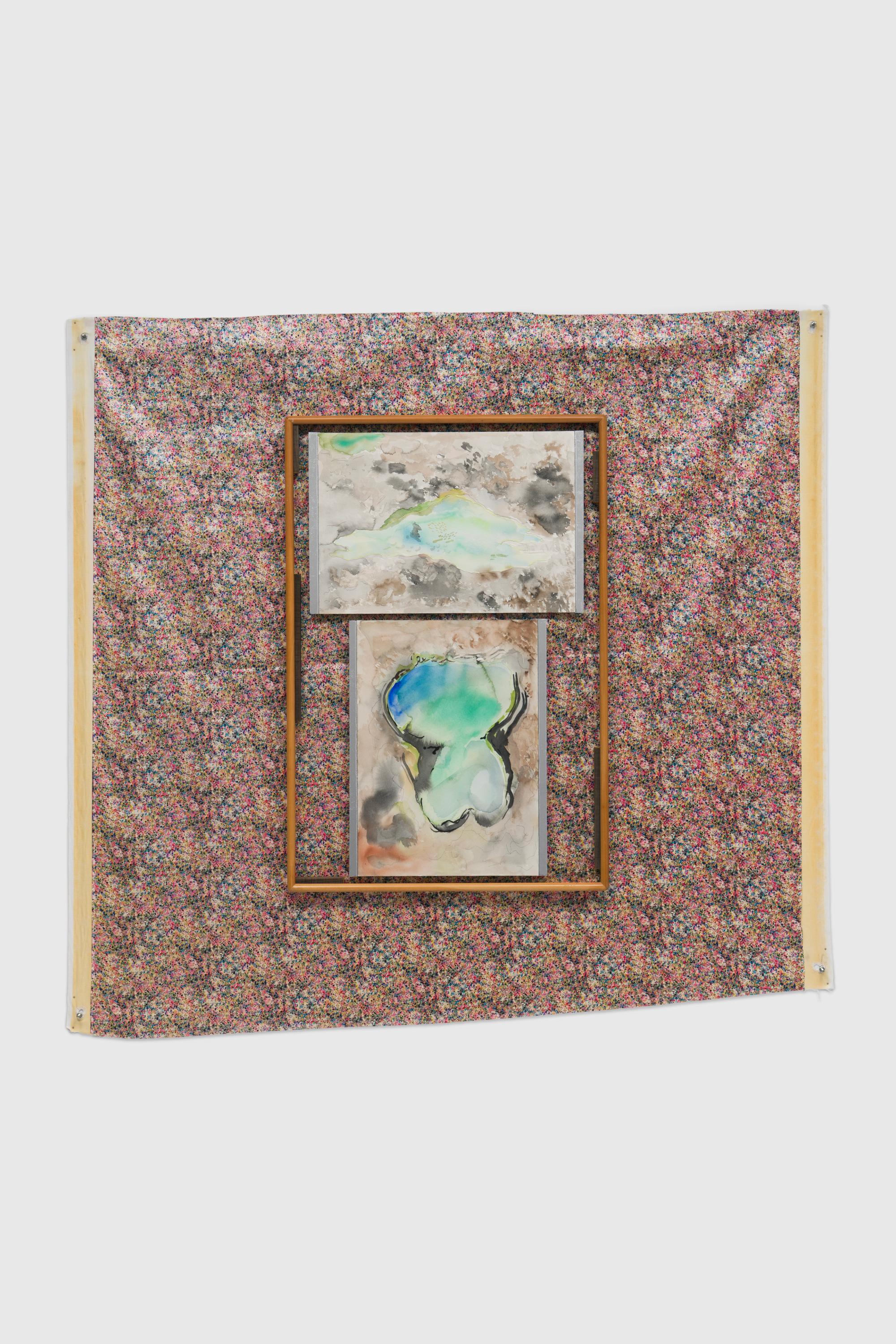 In her ongoing practice, Woo Kaufman makes garments from deadstock textiles sourced from jobbers and ragpickers. A jobber in Paris sold her a section of fabric (silk applied to canvas) that he attributed to Dior, which the artist has incorporated within a new artwork, Untitled (ʻAnaehoʻomalu fishponds, Kuʻualiʻi and Kahapapa) (2024–2025). Nailed to a wall in the gallery, the yardage forms the ground for a layered collage, with two watercolors on paper taped to the glass within a large, found open-back frame. The watercolors, which depict preserved fishponds the artist visited north of Kona in Hawai‘i, appear to float over the surface of the silk. Once used to harvest fish for kings, these ponds formed part of the larger land-tenure system known as ahupua‘a, which centered on access to stream waters. Today a Marriott hotel development envelops them, and Native Hawaiian stewards protect the ponds.