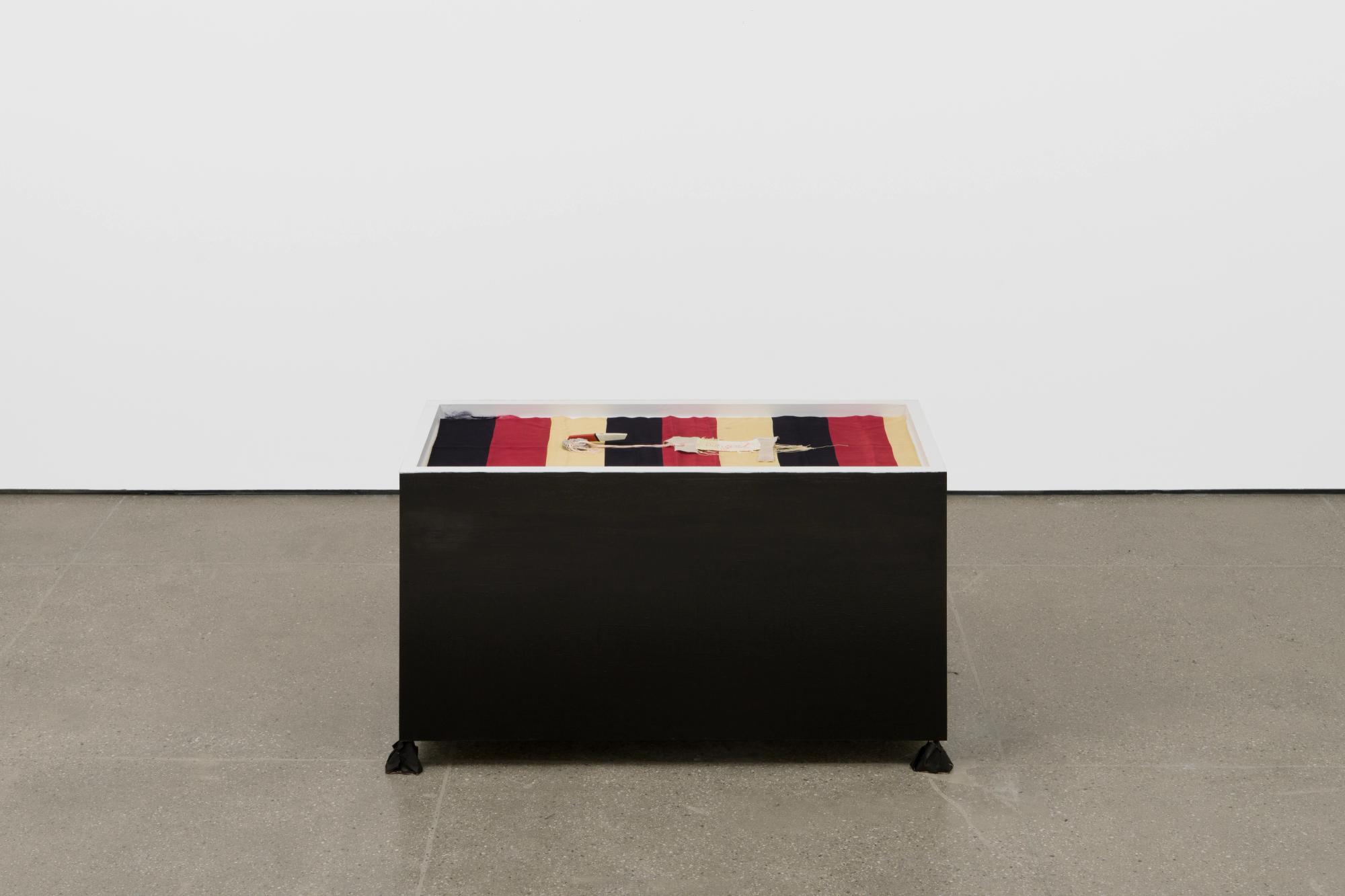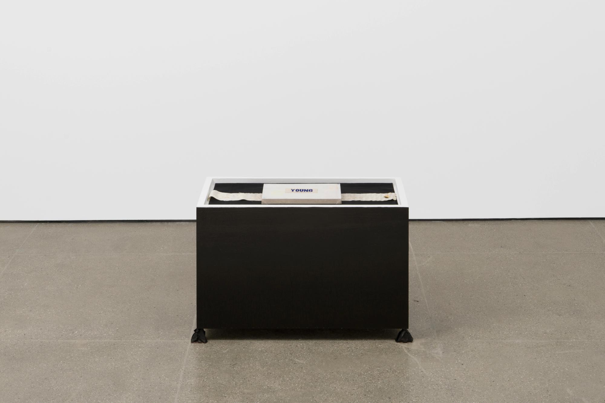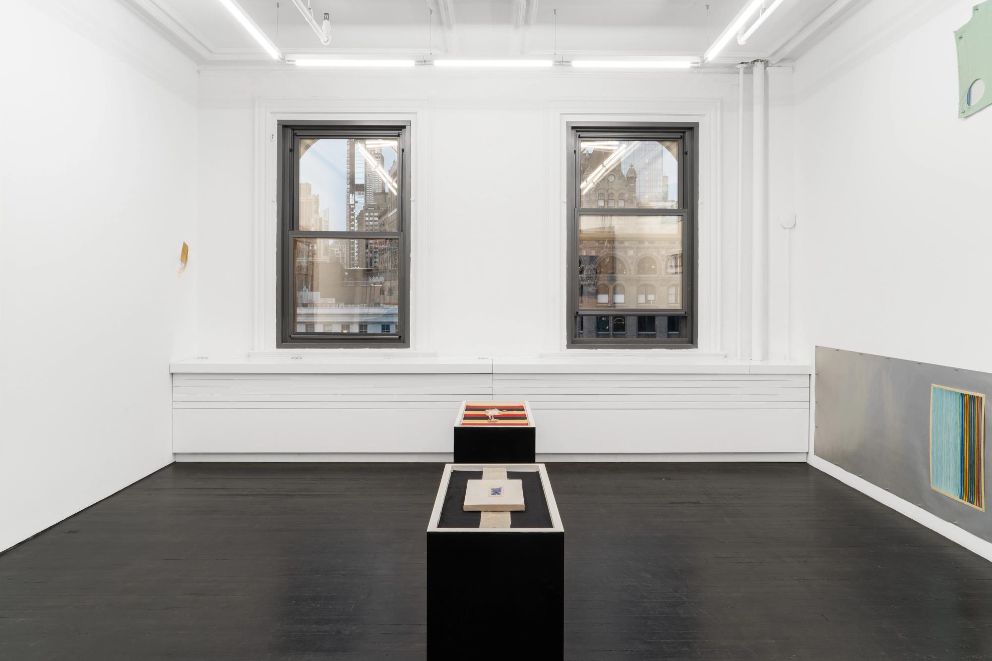 A recent assemblage, Untitled (angel food memory, white and yellow, needle threader) (2024–2025), is presented in the gallery on a pedestal designed and painted by the artist with Sumi ink. The central element of the work is a weaving made with deadstock Bunka, a Japanese embroidery thread typically unraveled into individual strands. Instead, the artist maintained the whole cord, onto which she embroidered the word “angel” and attached a needle threader emblazoned with the Trans World Airlines (TWA) logo. Previously wall-hung, here the object is laid on a silk remnant from Aichi, Japan. Of the work, the artist remarks: “The remnant is likely a fragment from a deconstructed kimono, which the current generation shows waning interest in preserving as heirlooms.”