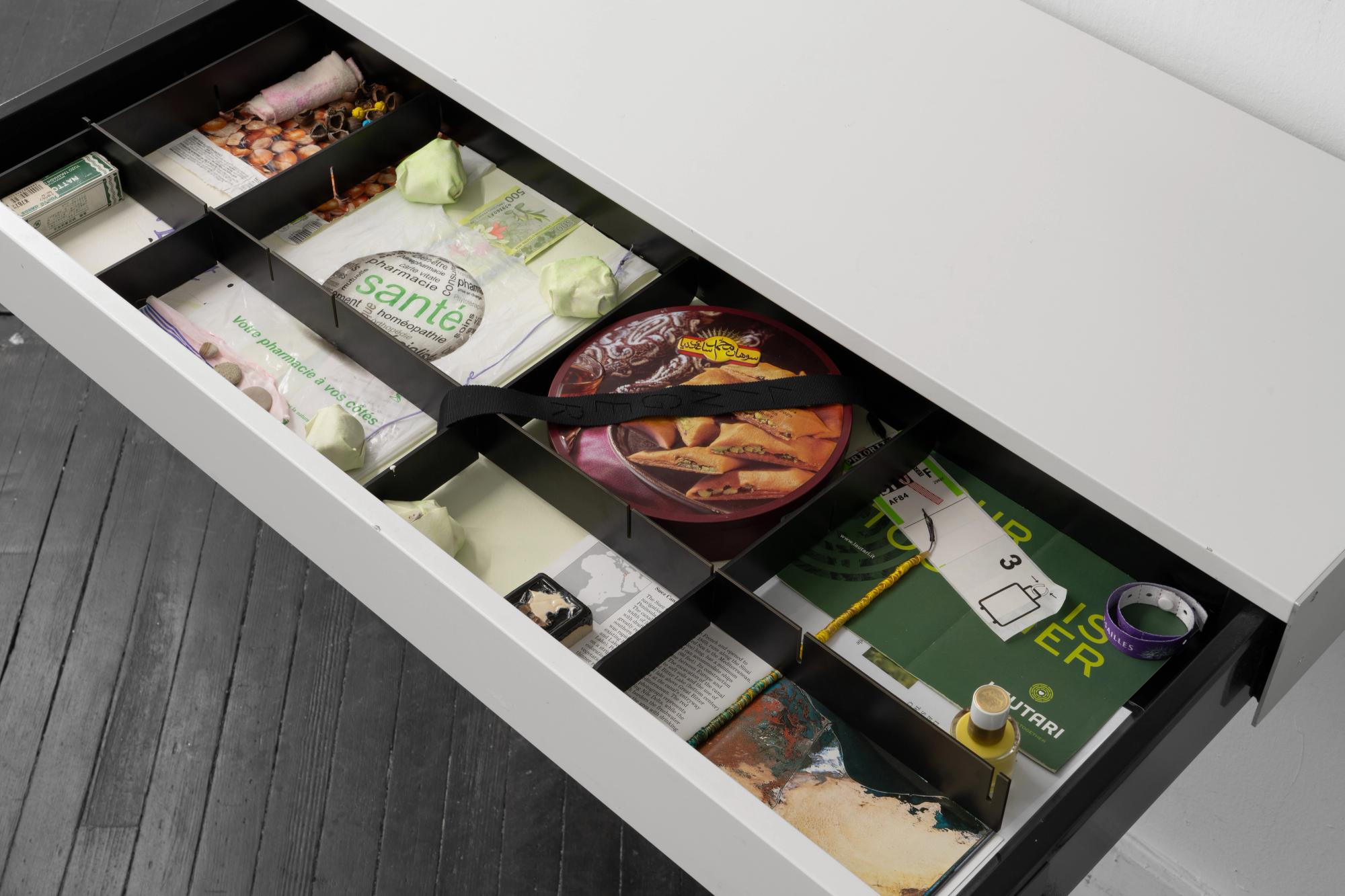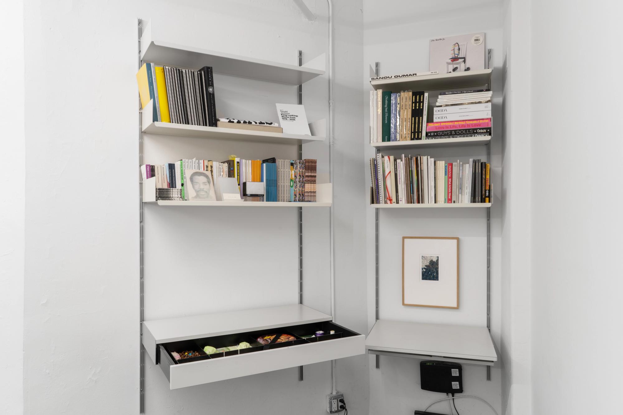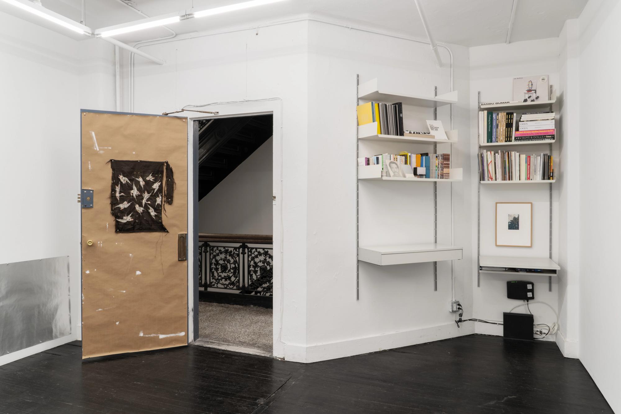 A recent assemblage, Untitled (angel food memory, white and yellow, needle threader) (2024–2025), is presented in the gallery on a pedestal designed and painted by the artist with Sumi ink. The central element of the work is a weaving made with deadstock Bunka, a Japanese embroidery thread typically unraveled into individual strands. Instead, the artist maintained the whole cord, onto which she embroidered the word “angel” and attached a needle threader emblazoned with the Trans World Airlines (TWA) logo. Previously wall-hung, here the object is laid on a silk remnant from Aichi, Japan. Of the work, the artist remarks: “The remnant is likely a fragment from a deconstructed kimono, which the current generation shows waning interest in preserving as heirlooms.”