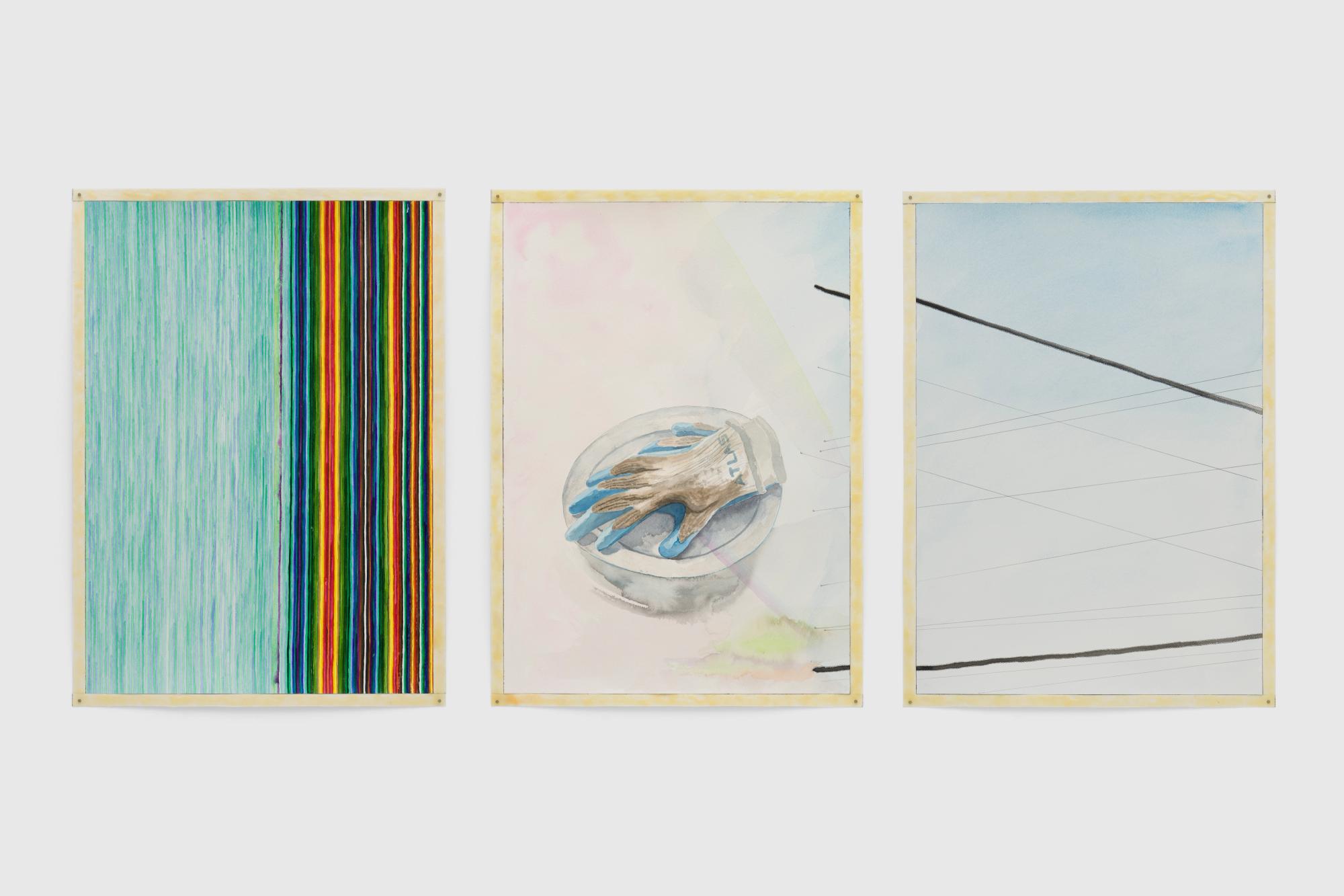 Expanding across the bottom of the gallery’s east-facing wall, Untitled (ATLAS) is a triptych of works on paper made with watercolors and wax and displayed on a ream of deadstock silver wallpaper that previously belonged to the artist’s grandmother. Each of the watercolor paintings depicts a different yet related image—thin vertical bands of saturated color, the artist’s gardening gloves, and a cropped view of wires against the sky—surrounded by a narrow wax border. After starting the pieces in early January of 2025, the painting process transitioned into a method of prayer as the fires in Los Angeles erupted and spread.