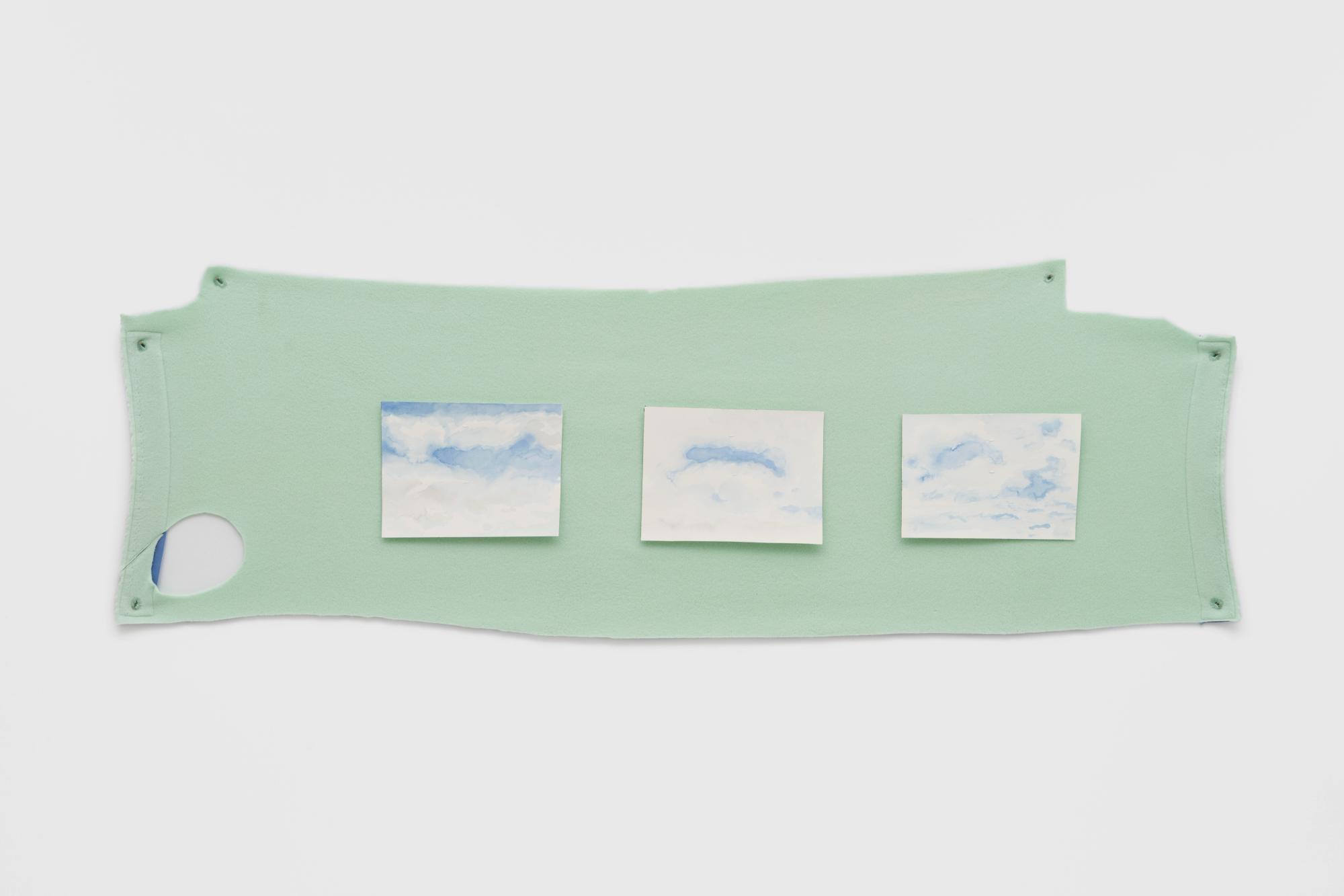 Found wool textile, cotton paper, watercolor, silk embroidery thread