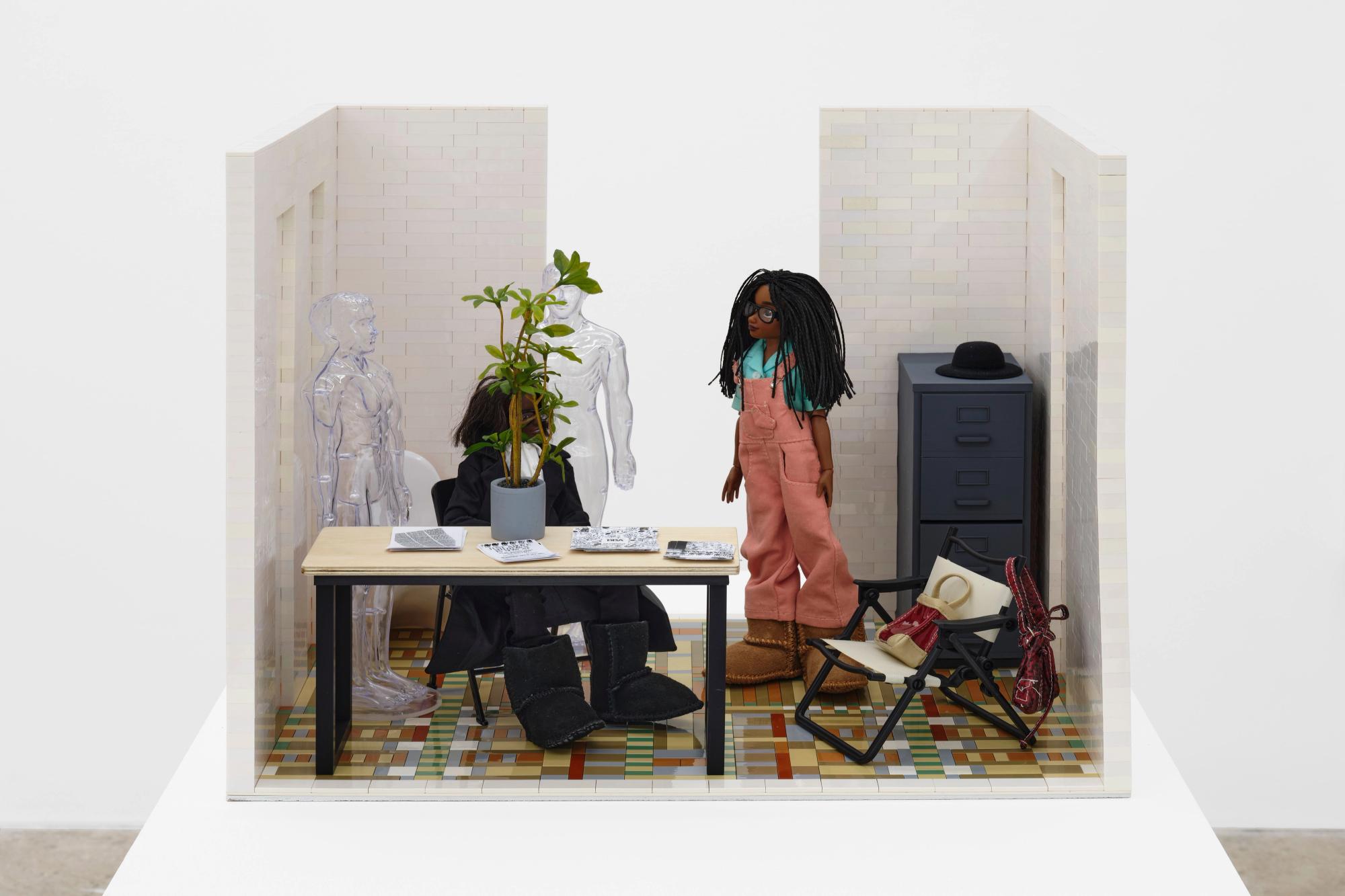 Cynthia and Janet at JAM on 57th Street (2024) is a new work created for this exhibition and is the most recent of Henry’s ongoing diorama constructions, which she began in the late 1970s. The series includes her seminal work The Studio Visit (1983), which features a Black doll, modified into a representation of herself, and a white doll – a curator – visiting the artist in her studio. Henry’s new diorama features two female black dolls that stand in for Hawkins and Henry, situated among office furniture, and two transparent plastic figures, within a room constructed with Lego-like building blocks. The work memorialises the occasion of Henry and Hawkins’ introduction at JAM, their five decades of friendship and mutual respect, and the importance of JAM as a supportive space that provided community and creative freedom.