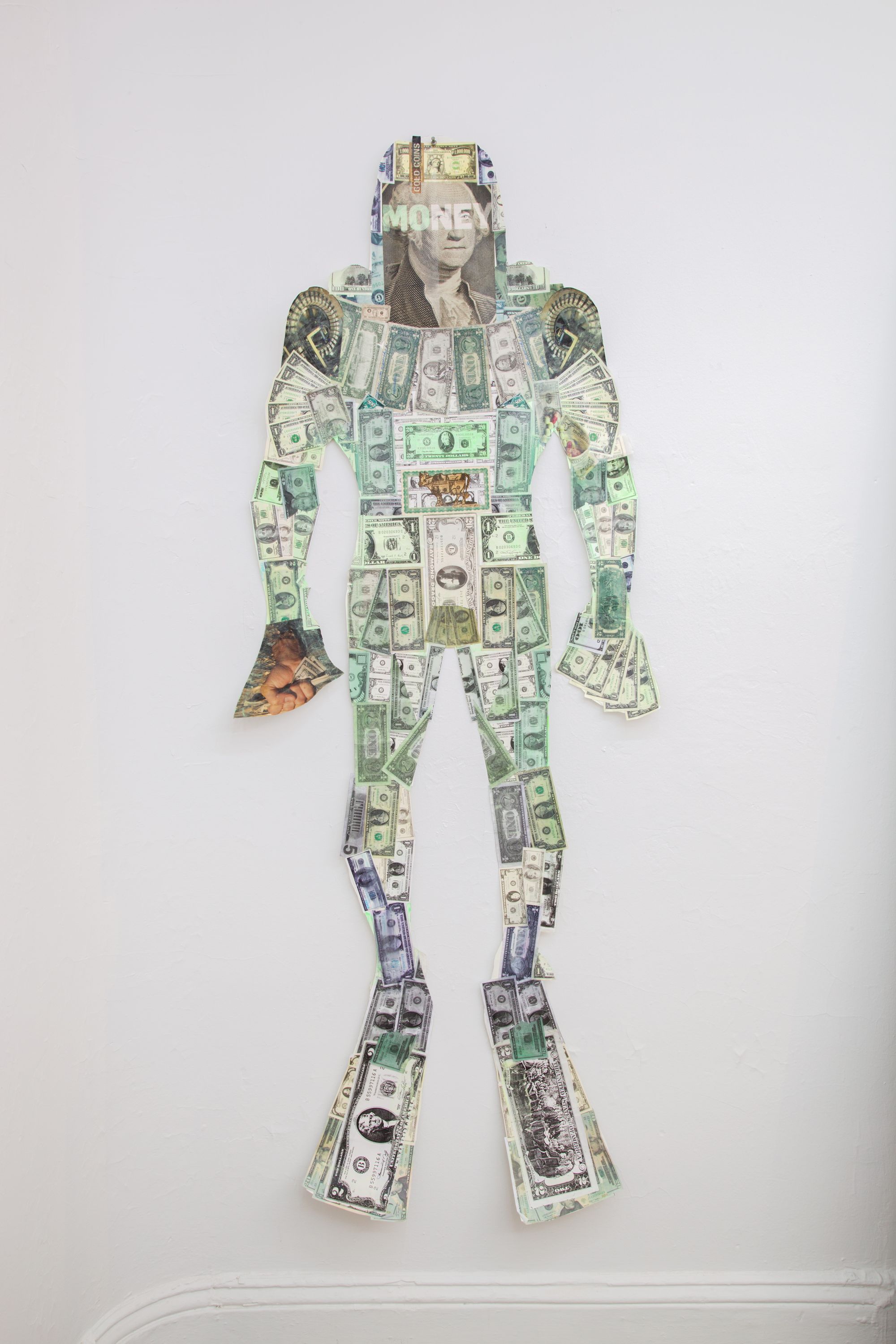 Frederick Weston extracts, categorizes, reproduces, pastes, and transplants images. He organizes them in an elaborate and highly subjective system of binders, plastic sleeves, and boxes. His archive is an image bank of personal and cultural references from which he culls material for his collages. Installed on a shelf, his eight-part work is an elaborate composite of real and fictional identities—identification and idealization—characters developed across the panels and in his related creative writing. In his paper figure, Money Man, images of green bills fill, circulate within, and exceed Weston’s own drawn and cut silhouette—a currency of color and power.