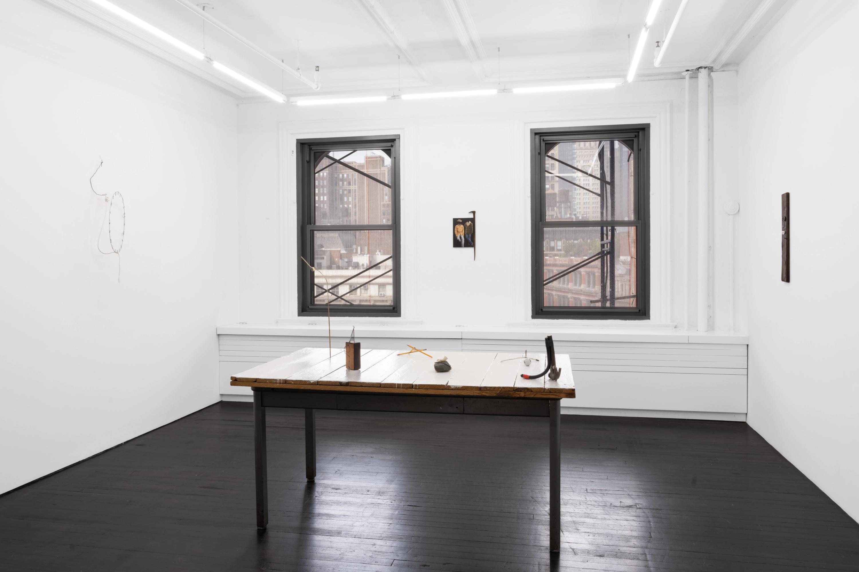 On the walls of the room, a group of two and three-dimensional artworks further develop Fitzpatrick’s mise-en-scène. A jury-rigged object made with a wire armature and a plaster rope appears to spring off the wall, suggesting a distorted clock with no hands. A framed photograph of disembodied cowboys is, in fact, an image of two costumes from the film Brokeback Mountain, which the artist appropriated from The New York Public Library Picture Collection. Hanging nearby, a wood plank stands in for a face: its eyes and nose, bits of trash, and its mouth, a meticulously painted bronze cast of used chewing gum. In the corner of the room, tucked behind the door, a small cardboard diorama depicts an uninhabited prehistoric landscape.