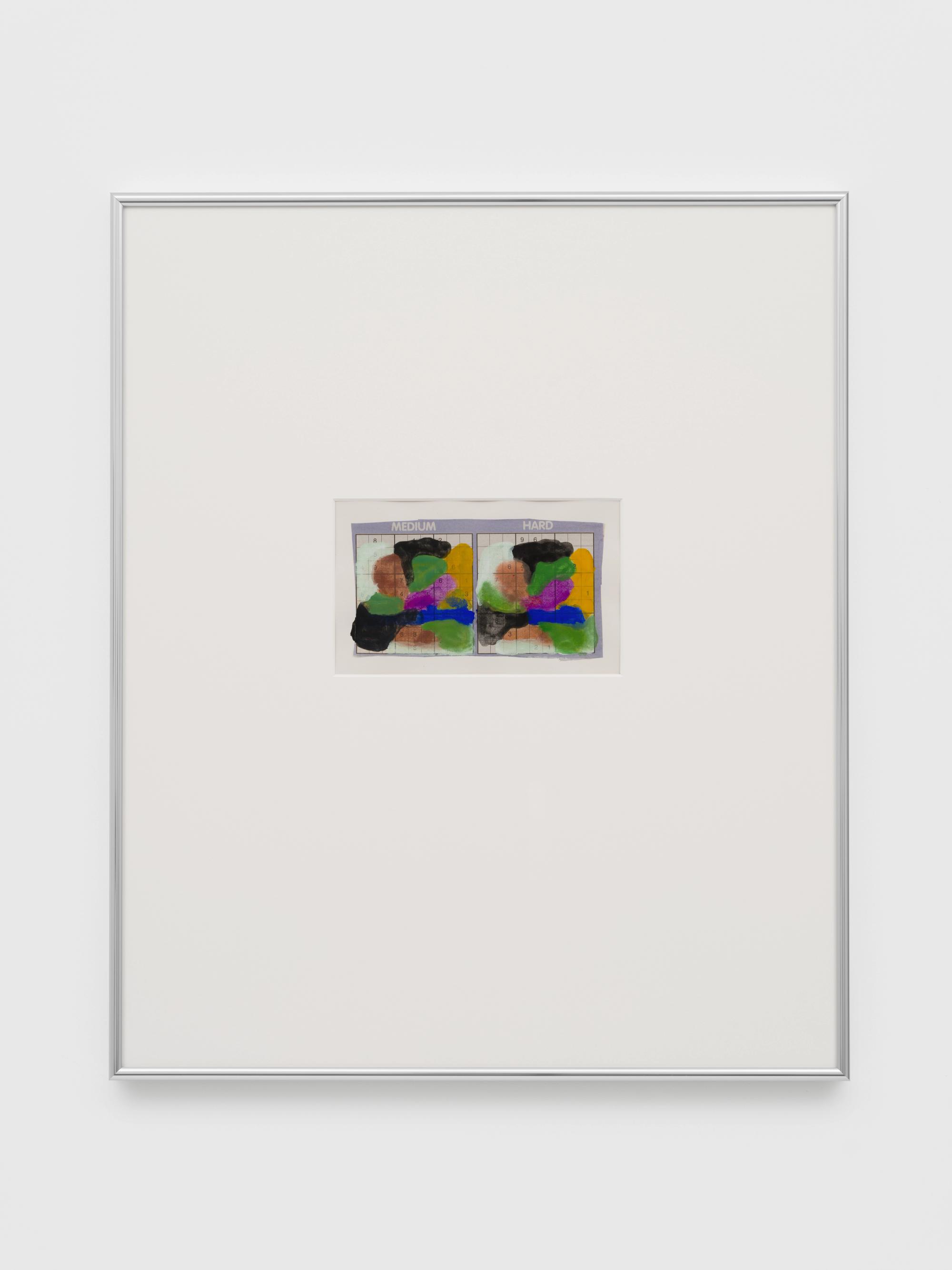 Griffiths’s use of papier-mâché evolved out of his daily painting routines. During a trip to New York and Los Angeles in 2017, he began cutting out blank crossword puzzles from newspapers, which he pasted into sketchbooks—one to a page—to create a prepared format. The serial structure and intimate scale lend themselves to his ongoing series of inventive gouache paintings, Yesterday’s Solutions, which rhyme with and against the grid. Griffiths recalls: “During the pandemic, I painted these small works at the kitchen table with the radio on in the background—often after washing the dishes and putting the kids to bed at night.”