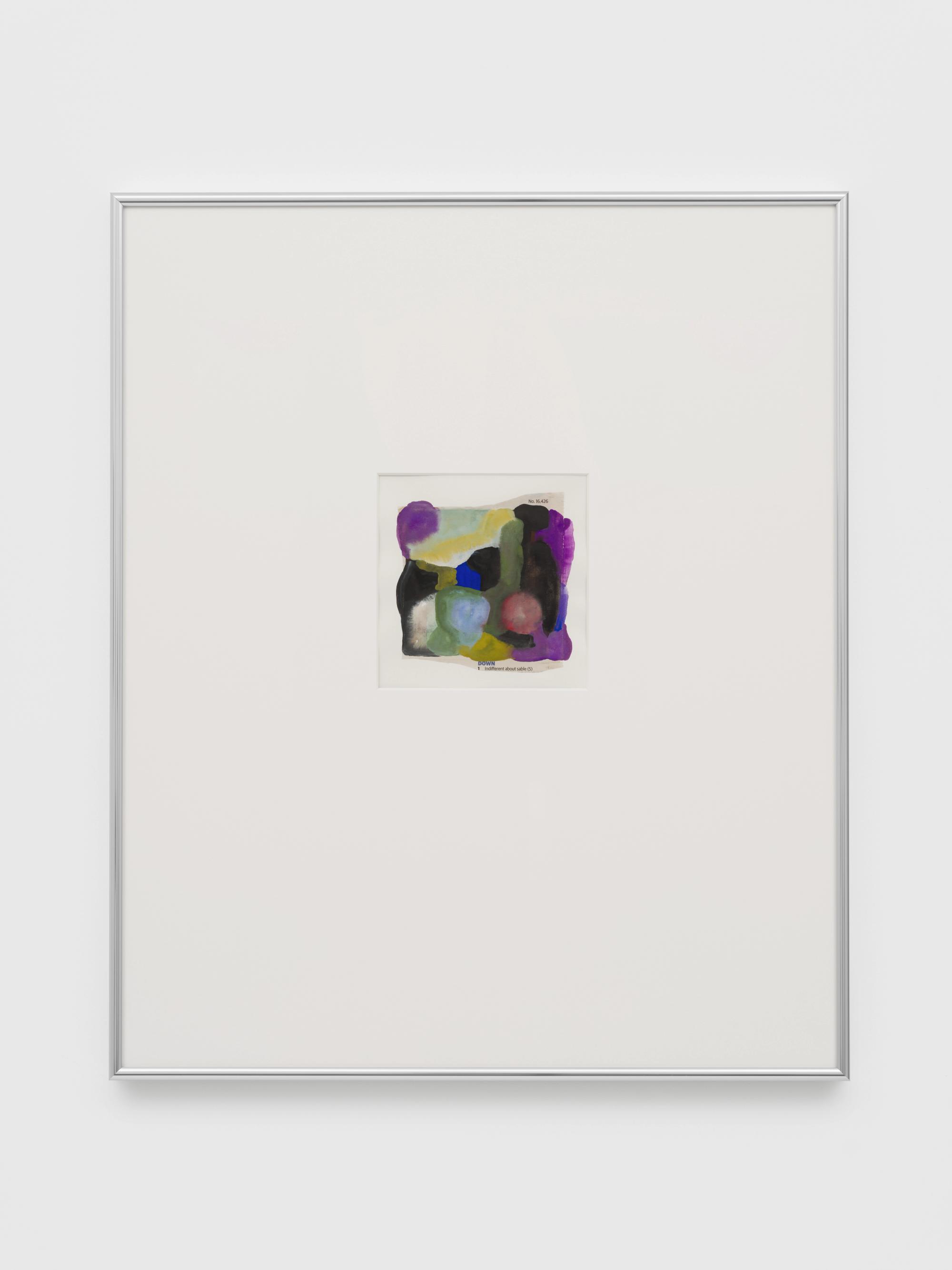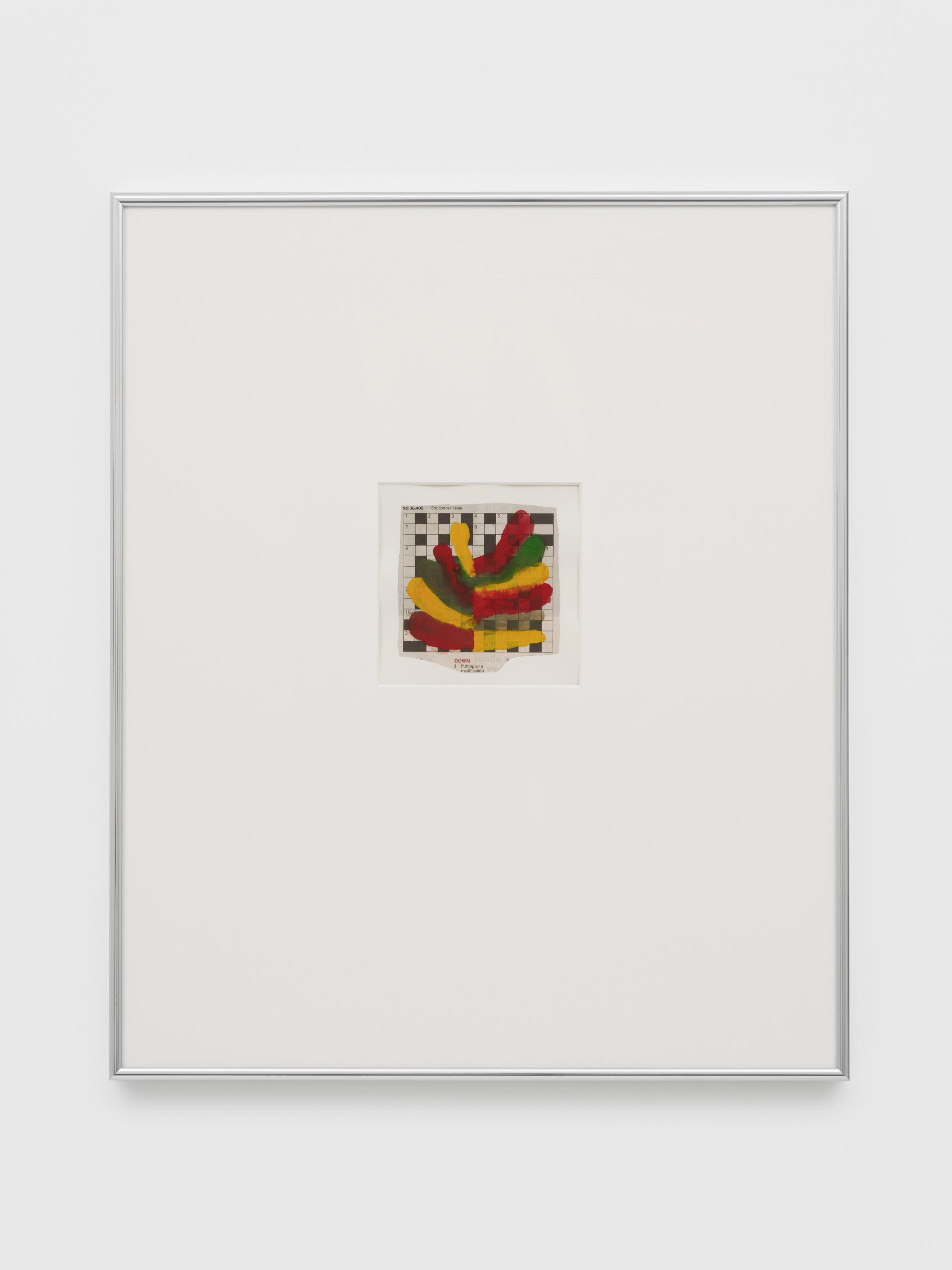 After seeing Griffiths’s crossword puzzle paintings in an exhibition, his parents began forwarding their newspapers, the enclosed puzzles peppered with their doodles, linguistic queries, and solutions, all of which the artist cuts out and incorporates freely into his work. In turn, the crossword clippings yield piles of newsprint remainders, which he salvages as raw material to papier-mâché the paintings. Throughout, Griffiths’s economy of materials and means facilitates his exploration of a distinct poetics of color, text, image, and process.