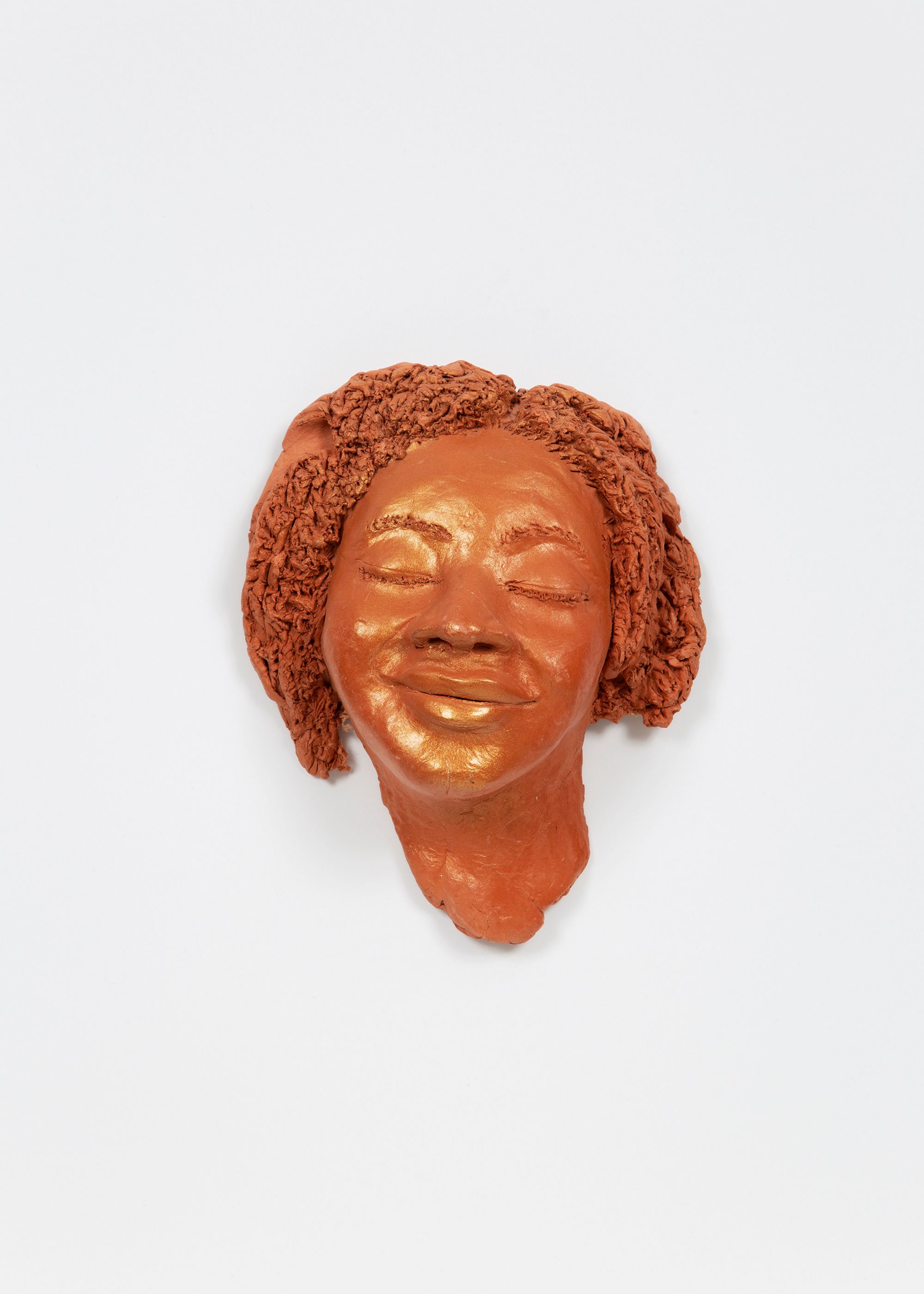 McDonald works primarily in her home, forming her figurative works with air-dry clay or terracotta and uses her kitchen table and sink as supports, as well as improvised tools such as an electric nail file. She embellishes her sculptures with humble materials and found objects endowed with personal significance: pearls from her late mother’s necklace, nail polish, cheesecloth, glass beads, earrings, aluminum foil, and African textiles. Throughout, the tender sculptures enshrine McDonald’s own life stories and wider cultural experiences of family, love, loss, illness, healing, and transformation.